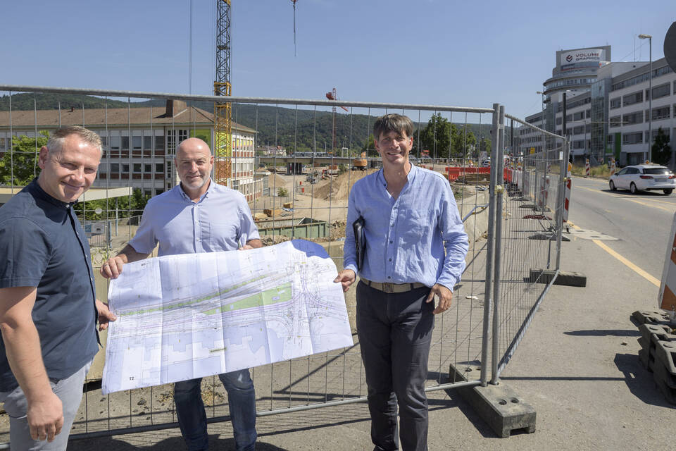 Bis Ende des Jahres soll der Querbahnsteig des Hauptbahnhofes bis zum Arkadengang der Stadtloggia am Europaplatz verlängert sein. Im Frühjahr, so der Plan, ist die Verbindung öffentlich zugänglich. "Dann wird die Bahnstadt ihrem Namen vollständig gerecht", sagte Bürgermeister Jürgen Odszuck, als er mit einem Team des Tiefbauamts die aktuellen Baustellen im Stadtteil besichtigte.