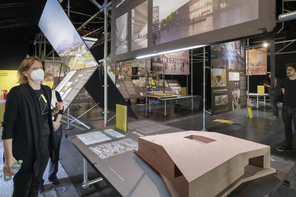 Über dem Modell schwebt ein Mobilé – eine klassische IBA-Metapher: Sie symbolisiert die Idee einer Stadt, in der sich keiner zu wichtig nimmt, jeder Raum bekommt und durch die gleichmäßige Verteilung von Vor- und Nachteilen alles im Gleichgewicht ist. "In einer Stadt gibt es Akteure mit großem Einfluss, etwa aus der Immobilienbranche", erklärt Ausstellungskuratorin Dorothea Deschermeier dazu. "Die IBA hat auch Menschen und Initiativen mit wenig Macht Raum gegeben." Als Beispiel nennt sie die Initiative Teilseiend und ihre Idee einer Muslimischen Akademie – ein IBA-Projekt, das noch in der Planungsphase ist.