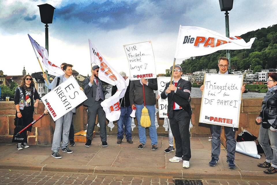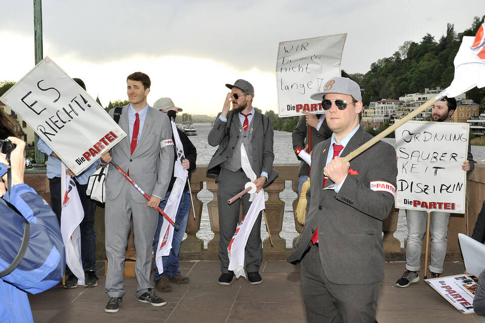 "Die Partei" trug an der Alten Brücke die traditionelle Walpurgisnachtfeier auf der Thingstätte symbolisch zu Grabe. Foto: Gerold