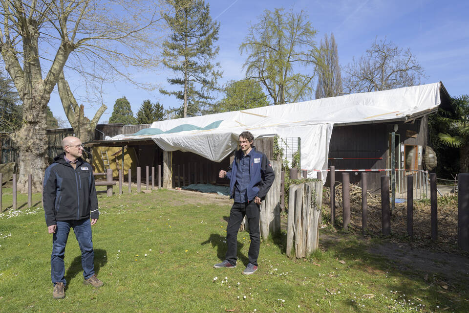 Erst einmal musste der Ast runter, anschließend wurde das Dach abgedeckt. "Darin war Asbest verbaut, deshalb musste eine Spezialfirma kommen. Allein das Abdecken hat zweieinhalb Wochen gedauert", berichtet Thomas Pöschko, Kaufmännischer Geschäftsführer im Zoo, am Montagvormittag. Vor wenigen Tagen war der Statiker da. Wenn sein Ergebnis vorliegt, können die konkreten Planungen losgehen.