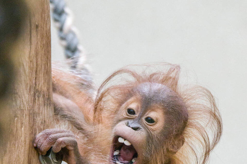 Das Orang-Utan-Baby Berani hat erst am 21. März seinen ersten Geburtstag im Heidelberger Zoo gefeiert. Foto Heidrun Knigge/Zoo Heidelberg