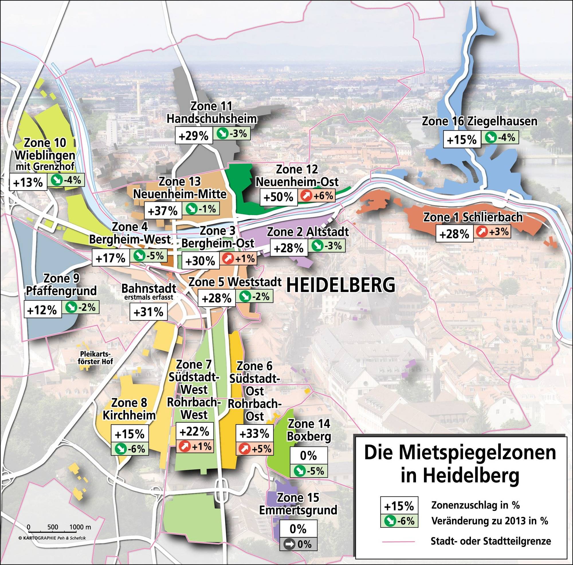 In Heidelberg gibt es je nach Lage erhebliche Unterschiede bei den erlaubten Zuschlägen. Der Mietspiegel erfasst aber nur die neuen oder geänderten Verträge der letzten vier Jahre. Grafik: Peh & Schefcik