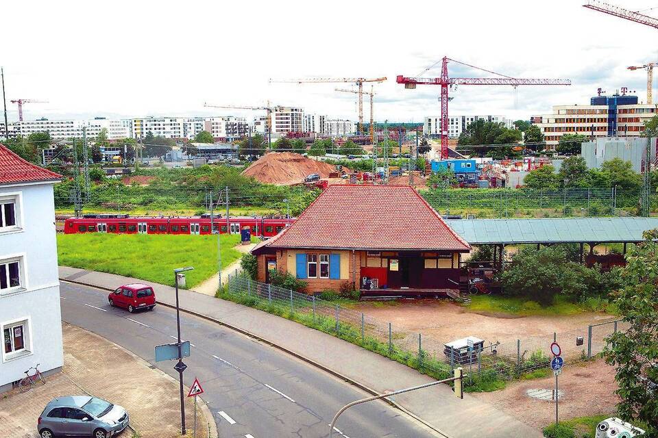 Rechts neben dem alten OEG-Bahnhof beginnt die Brücke und führt von dort aus gerade in die Bahnstadt. Foto: Alex