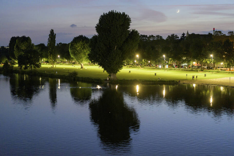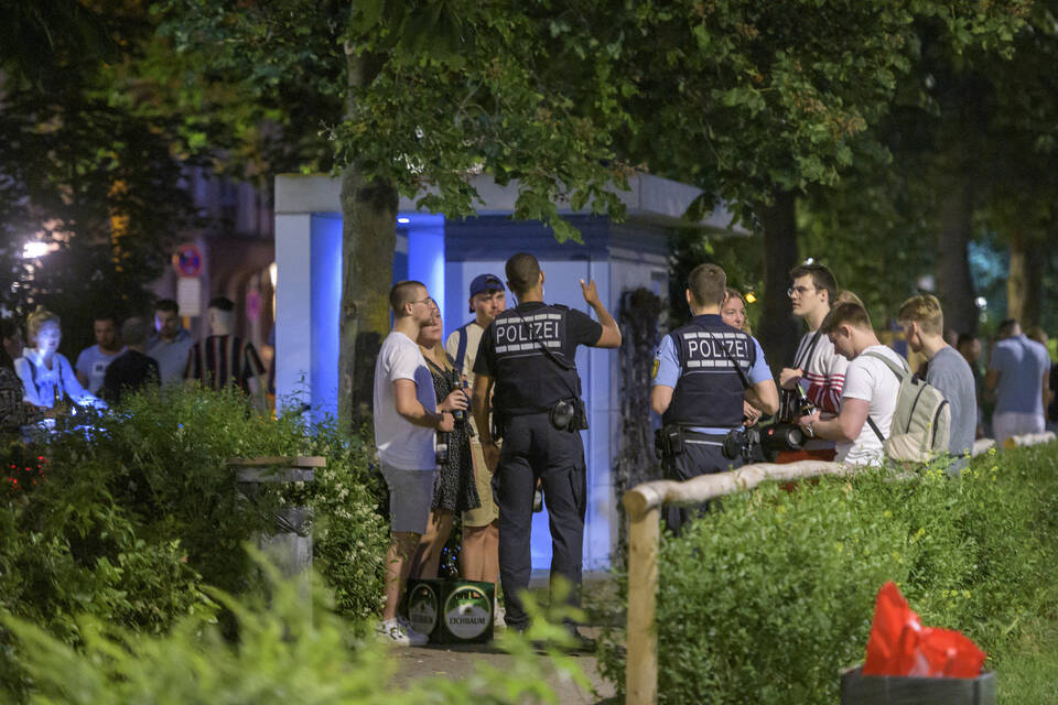 > 22 Uhr – Das Aufenthaltsverbot tritt in Kraft: Friedlich bleibt es auch, als die Polizei pünktlich um 22 Uhr beginnt, die Neckarwiese zu räumen. In den Wochenendnächten galt – als Reaktion auf Krawalle von Pfingsten – wieder ein Aufenthaltsverbot von 22 und 6 Uhr. Kaum ist die Sonne untergegangen, blitzen die Taschenlampen der Beamten auf. Ein kleines Aufgebot schlendert gelassen über die Wiese und spricht die verbliebenen Besucher freundlich, aber bestimmt an. Meist ist das aber gar nicht nötig. Nachdem sich die Anwesenheit der Polizisten herumgesprochen hat, packen die meisten ihr Hab und Gut von selbst zusammen. Als gegen 22.20 Uhr noch die sogenannte "Stresserbeleuchtung" eingeschaltet wird, gehen auch die Letzten freiwillig – viele machen sich auf den Weg in die Altstadt. Bloß ihren Müll lassen manche auf der Grünfläche zurück.