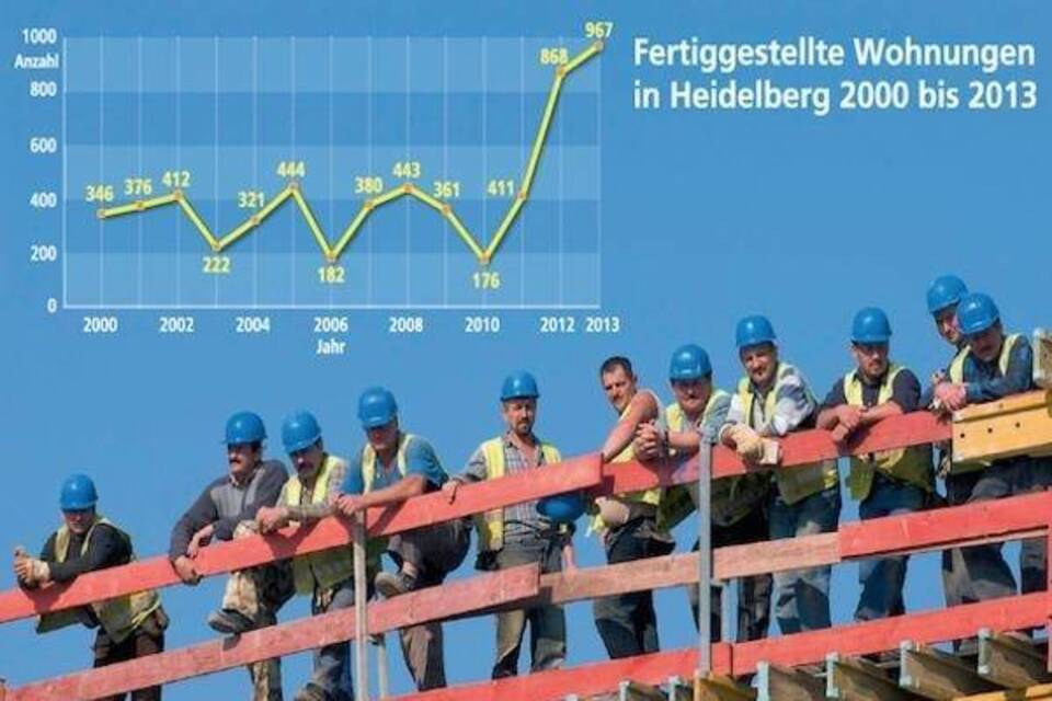 In Heidelberg gibt es abermals einen neuen Wohnungsbaurekord: 967 neue Einheiten wurden 2013 fertig, schon im letzten Jahr waren es 868. Damit liegt die Stadt zum zweiten Mal deutlich über der Zielmarke von 500 neuen Wohnungen pro Jahr, die das städtische Wohnentwicklungsprogramm formuliert hatte. In den Jahren von 2000 bis 2010 wurde diese Marke deutlich verfehlt, da wurden im Schnitt nur 333 Einheiten pro Jahr gebaut.