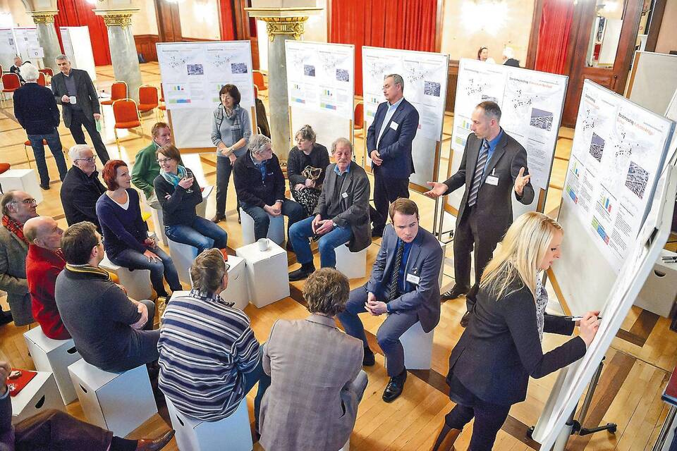 In Gruppen diskutierten rund 150 Bürger in der Stadthalle über die insgesamt 28 Vorschläge rund um den Bahnhof, die Ernst-Walz-Brücke und den Bismarckplatz. Foto: Rothe