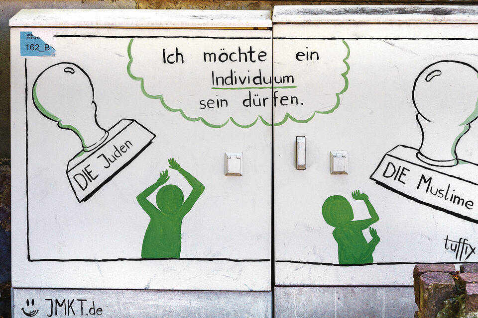"Ach so, nichts mit Krieg", soll laut Tuffix ein Passant am Dienstag gesagt haben, als sie an ihrem ersten Stromkasten arbeitete. "Genau das ist das Problem", erzählt sie. In der Beziehung zwischen Juden und Muslimen bestimmten nämlich zumeist gewaltvolle Aspekte das äußere Bild. Oft gehe es um Konflikte außerhalb Deutschlands. Die Realität hier vor Ort wird schnell übersehen.