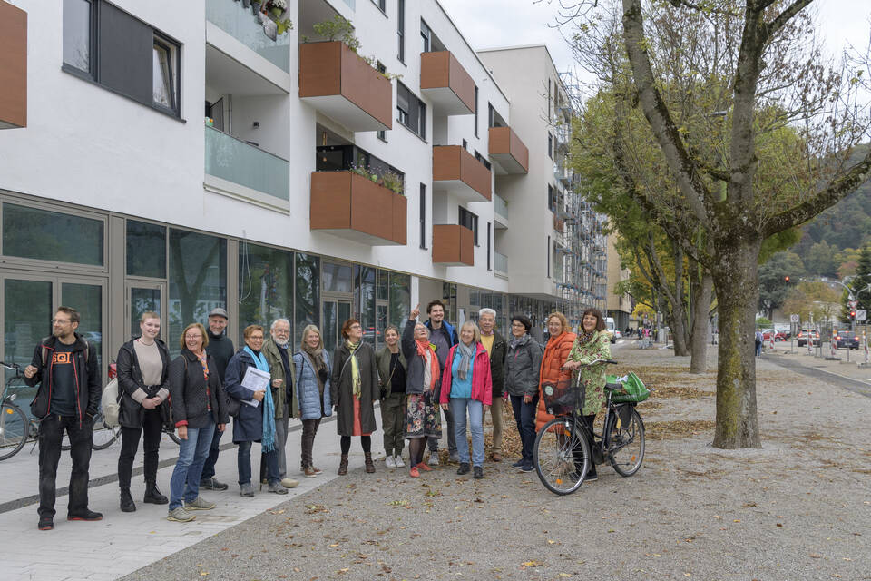 Noch trister als die Rhein- präsentiert sich die Roeblingstraße. Ein neun Meter breiter Gehweg inklusive Parkplätzen aus grauen Verbundsteinen sorgt bei allen Teilnehmern für Kopfschütteln. Ein paar Meter weiter, in der Mark-Twain-Straße, kämpft Christoph Gran seit einem guten Jahr für weniger Parkplätze und mehr Grünfläche. Er hat bei dem gemeinschaftlichen Wohnprojekt "Horizonte" eine "AG Umwelt verschönern" gegründet. Die Bewohner waren sich schnell einig: 20 Parkplätze brauchen sie nicht vor ihrem Haus. Fünf davon wollte man in Grün- und Aufenthaltsflächen umwandeln und sich darum selbst kümmern. Gran setzt sich auch dafür ein, dass die Oberflächen der restlichen Parkplätze nicht vollständig mit Verbundsteinen geschlossen werden. "Die Stadt gibt sich Mühe", betont er. Aber sie orientiere sich zu sehr an alten Plänen, es sei mühsam, in diese Prozesse neue Ansätze hineinzubekommen. "Man muss um jeden Zentimeter Grün kämpfen." Das bestätigen auch Bewohner des benachbarten Wohnprojekts "Woge".