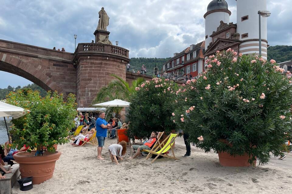 > Am Stadtstrand am Neckarlauer vor der Stadthalle können Besucher im Liegestuhl oder direkt im Sand sitzen. Drinks gibt es an der Strandbar. Kostenlose Bootsfahrten verbinden den Stadtstrand mit der Alten Brücke – auch dort lädt ein Strand zum Verweilen ein.