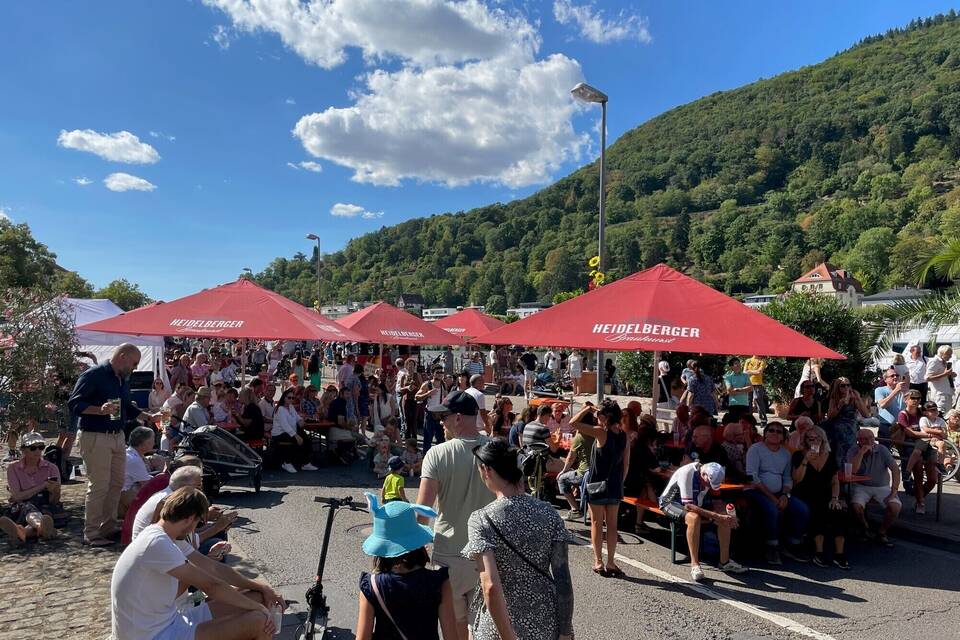 Bei der Eröffnungsrede des Fests von Oberbürgermeister Eckart Würzner steht die gute Stimmung noch etwas auf der Kippe. Der Himmel ist grau, leichte Nieseltropfen fallen auf die noch wenigen Besucher. Doch zeitgleich mit dem Aufklaren des Himmels füllt sich die Pop-Up-Flaniermeile am Neckar.