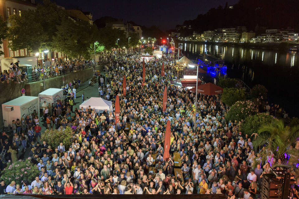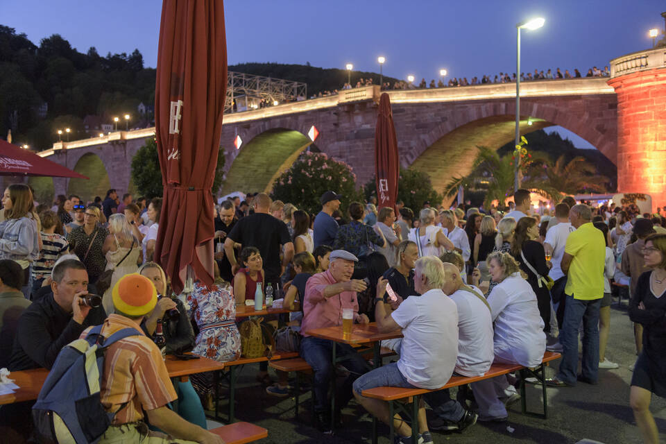 Auf zwei Bühnen wird ein sehr abwechslungsreiches Programm geboten. Auf der großen Hauptbühne an der Alten Brücke eröffneten "Heidelberg Jazz Man" das Fest mit Jazzstandards wie "Girl From Ipanema" oder "Fly Me To The Moon". Direkt davor können sich die Besucher auf Bierbänken oder dem eigens aufgeschütteten Stadtstrand entspannen und das gute Wetter genießen. Lenz S. ist spontan mit seinem Fahrrad zum Stadtstrand gefahren, um Sonne zu tanken und einen Aperol Spritz zu trinken: "Das ist viel lockerer dieses Jahr, letztes Jahr gab es ja die Einlasskontrollen."