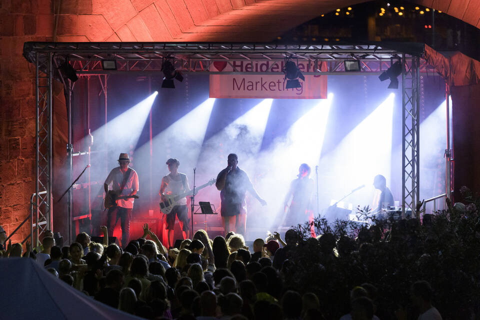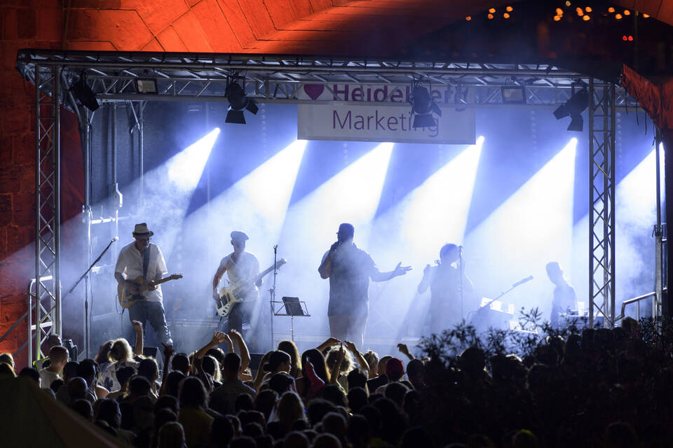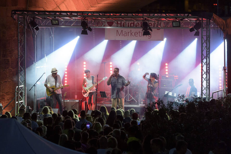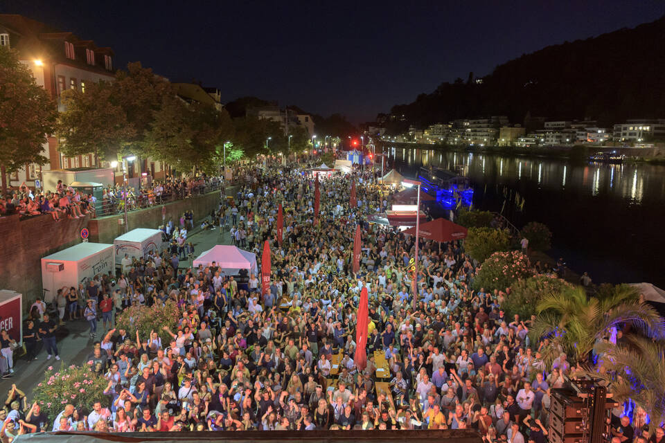 Auch zur Bühne an der Alten Brücke strömen am Samstagabend immer mehr Menschen. Sie sehen den Auftritt der selbstbeschriebenen "Nummer Eins Partyband der Rhein-Neckar-Region": Amokoma. Wo tagsüber noch manche Bierbank leergeblieben war, ist inzwischen jeder Platz besetzt. Viele weichen auf den eigens aufgeschütteten Neckarstrand direkt an der Alten Brücke aus. Dort verkauft das Team der "Neckarorte" Getränke, was von den Besuchern dankend aufgenommen wird.