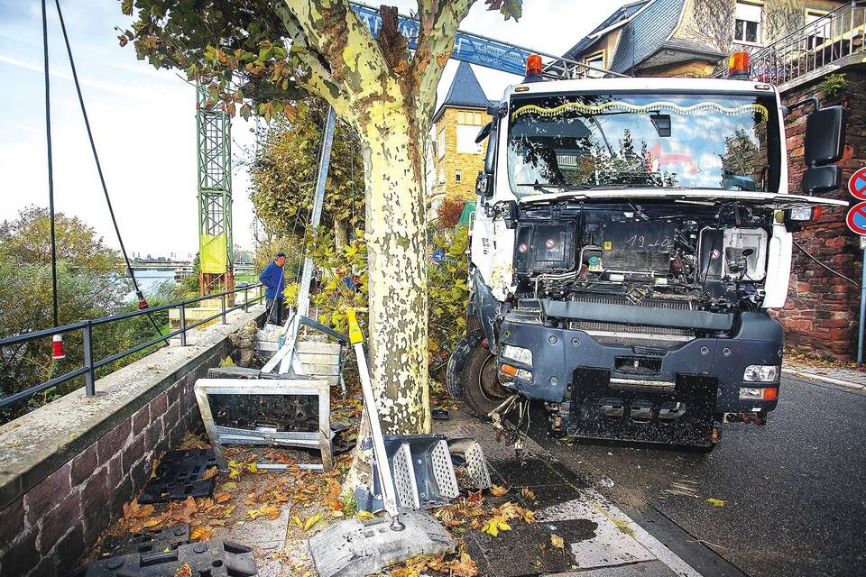 Ein Lastwagen der städtischen Straßenunterhaltung war unterwegs zu einer Baustelle in der Hirschgasse, als laut Polizeibericht das Vorderrad in einer Engstelle gegen den Bordstein prallte. Anschließend sei das Lenkrad herumgeschlagen, der Fahrer habe die Kontrolle über das Fahrzeug verloren, das dann frontal in eine Platane am Straßenrand krachte. Der Fahrer zog sich bei dem Zusammenstoß nur leichte Verletzungen zu, der Laster war jedoch nicht mehr fahrbereit. Zudem wurde beim Unfall die Kabelbrücke der gegenüberliegenden Baustelle heruntergerissen.