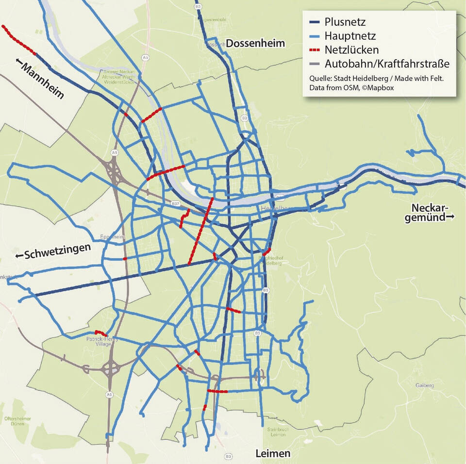 Nach bisherigem Stand sind eine gute Handvoll solcher Plus-Strecken mit einer Breite von mindestens drei Metern (vier Meter bei Verkehr in zwei Richtungen) geplant – von Mannheim, Schwetzingen, Rohrbach, Neckargemünd und Dossenheim jeweils bis in die Innenstadt. Außerdem über die beiden zentralen Neckarbrücken sowie rund um die Weststadt.