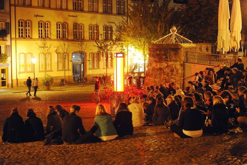 Der Freiburger Augustinerplatz ist bei jungen Menschen nachts ein beliebter Treffpunkt. Viele bringen ihren eigenen Alkohol mit. Im Hintergrund zeigt die "Säule der Toleranz" den Nachtschwärmern farblich an, wann sie nach Hause gehen sollten. Wird die Säule rot, ist es Zeit zu gehen - allerdings bleiben viele gerade dann noch sitzen, weil der Rotton so eine gemütliche Stimmung erzeugt. Foto: dpa