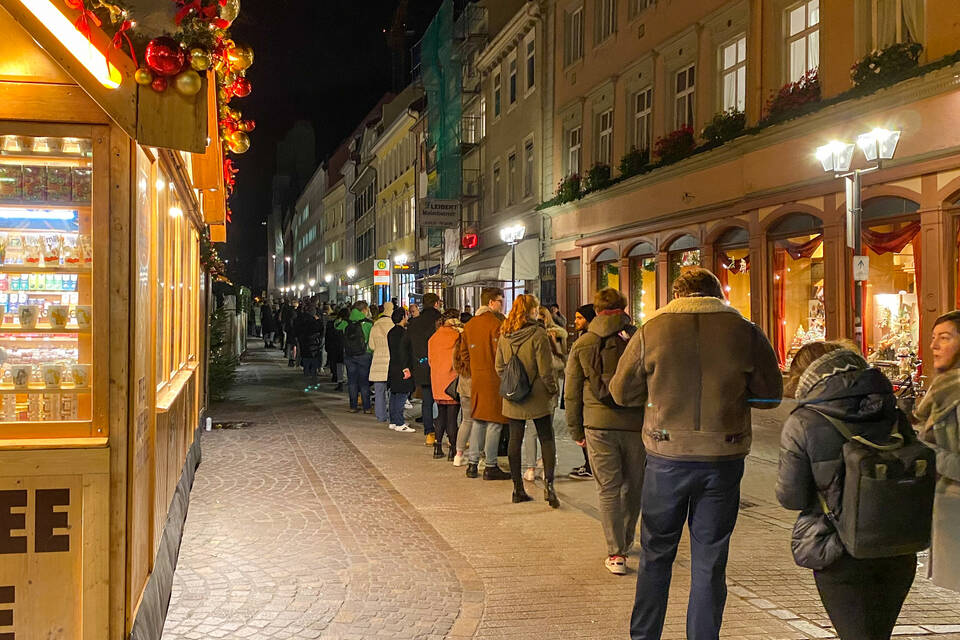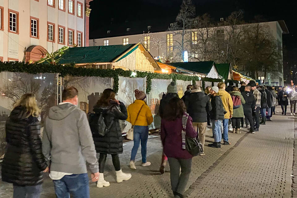 Während Bohnert und zwei ihrer Kommilitoninnen gegen 18 Uhr schon Glühweintassen in der Hand hatten, führte die Schlange vom Einlass in der Grabengasse gut 100 Meter bis zur Hauptstraße. Denn das Prozedere dauert: Jeder Gast muss sein Impf- oder Genesenenzertifikat vorzeigen und mit dem Smartphone (oder handschriftlich) einchecken. Dann gibt es ein rotes Bändchen, mit dem man für die gesamte Dauer des Weihnachtsmarkts auf alle vier Plätze kommt.