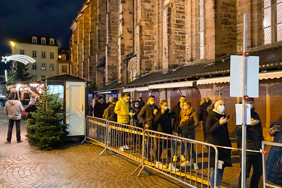 Während es am Karlsplatz und Kornmarkt auch am Abend eher ruhig blieb, wurde neben der Schlange am Uniplatz auch die am Marktplatz ab etwa 18.30 Uhr immer länger. Das eingezäunte selbst aber war ab 19 Uhr lediglich gut gefüllt, das übliche, dichte Gedränge früherer Weihnachtsmärkte herrschte nicht.