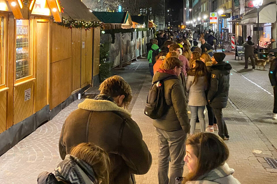 "Das muss sich noch einspielen", sagte Weihnachtsmarkt-Leiter Joe Schwarz. "Uns ist wichtig, dass alles korrekt läuft, aber das kann am Anfang eben noch etwas länger dauern." Er freute sich, dass viele Besucher die Kontrollen begrüßten und geduldig warteten. "Man merkt, dass die Menschen Lust haben, in sicherer Umgebung Weihnachtsstimmung zu erleben." Und tatsächlich: Die Stimmung war gut, die Gäste entspannt. Und auch von einigen Standbetreibern fiel die Anspannung am Abend, als besonders an den Essens- und Getränkeständen gut was los war, nach und nach ab.