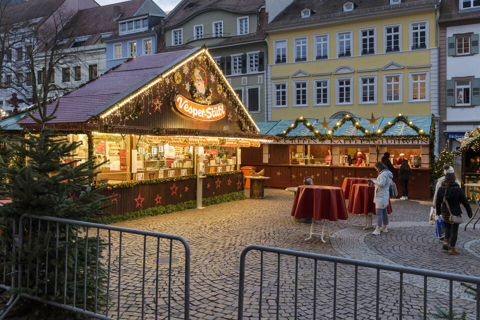 Heidelberg. (rie) Der Heidelberger Weihnachtsmarkt ist eröffnet. Am Donnerstag um 11 Uhr machten die Glühwein-, Bratwurst- und Kunsthandwerk-Buden auf, doch war der Andrang zur Mittagszeit noch verhalten. Die vier größeren Standorte sind eingezäunt: Denn am Universitätsplatz, am Marktplatz, am Kornmarkt und am Karlsplatz kommt man nur mit 2G-Nachweis auf das Gelände mit den Buden. Am Eingang wird der Impfnachweis kontrolliert, zudem müssen sich Gäste per Luca- oder Corona-Warnapp einchecken. Im Gegenzug bekommen sie dann ein rotes Bändchen, das auch für die nächsten Wochen als "Eintrittskarte" zu den vier Plätzen gültig ist.