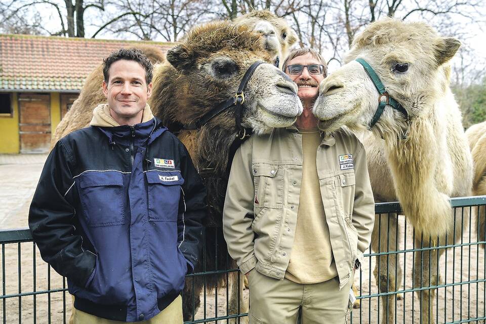 Auch die Kamele gehören zum Robben- und Raubtierrevier im Heidelberger Zoo, das Andreas Fackel (links) nun leitet. Beim Fototermin herzen die beiden Tiere seinen Vorgänger Jörg Kubacki. Foto: Philipp Rothe