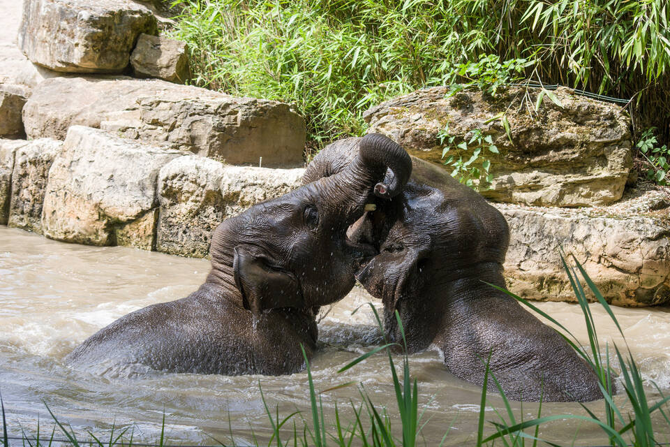Wasserstellen in den Gehegen sind im Sommer besonders beliebt, teilt der Zoo mit. Die Elefanten-Jungbullen Tarak, Yadanar, Gandhi und Ludwig genießen das gemeinsame Bad. Im großen Außenpool ist Platz für alle vier Dickhäuter. Die jungen Elefantenbullen sind hierbei nicht zimperlich: Es wird getunkt, gespritzt und geprustet, was das Zeug hält – oftmals guckt nur noch der Rüssel aus dem Wasser.