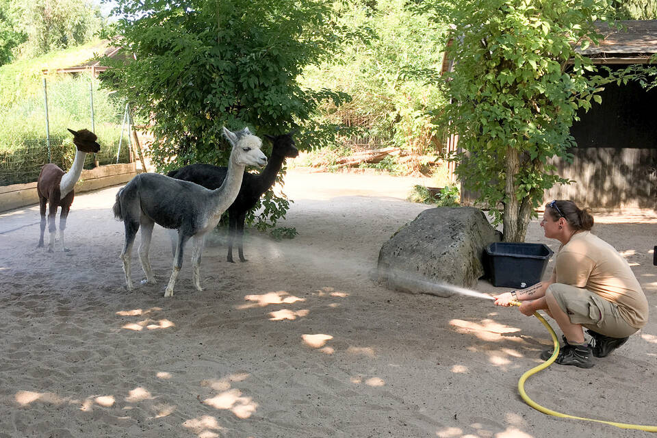Auch eine Abkühlung per Wasserdusche ist willkommen. Die Alpakas lieben es, unter dem kühlen Wasserstrahl zu stehen. Von allen Seiten lassen sie sich von den Tierpflegern das Fell und die Haut nass machen. Das kühlt wunderbar von außen.
