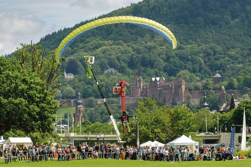 Action gab’s nicht nur im Wasser: Ein Gleitschirmflieger schwebte auf der Neckarwiese ein.