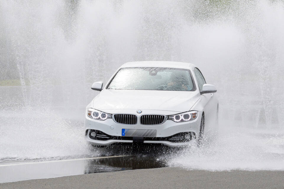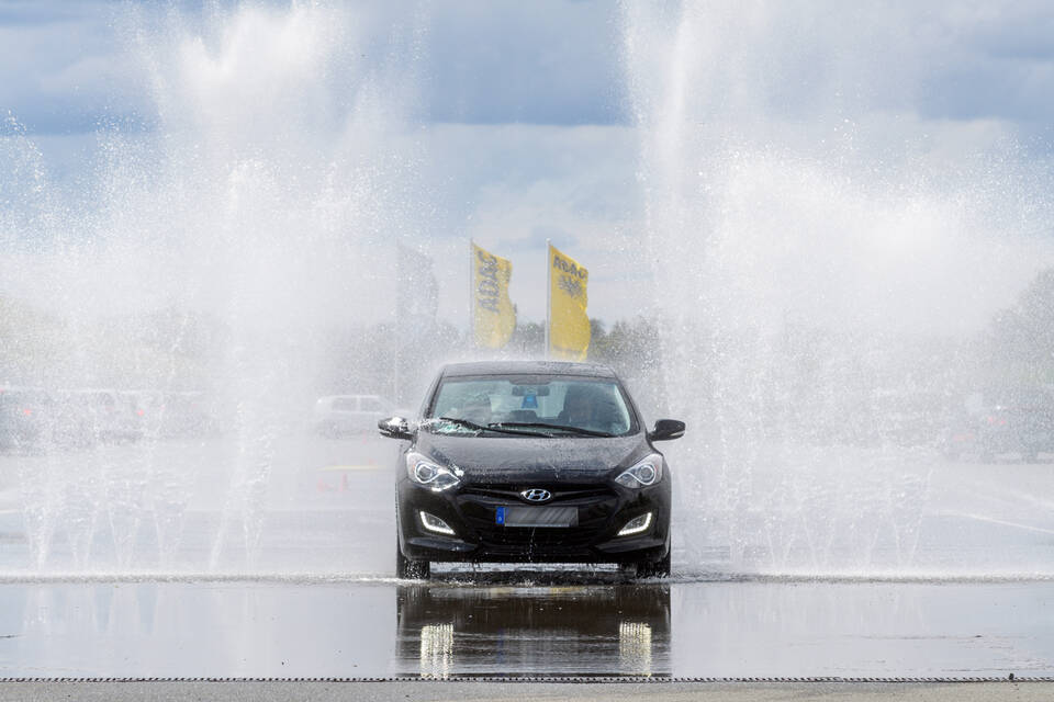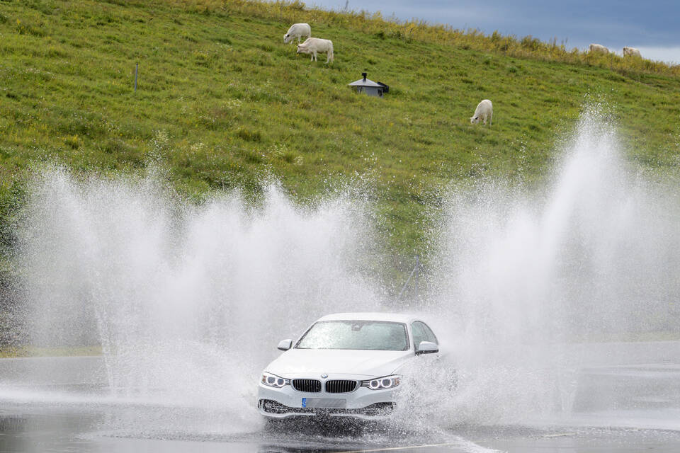 Bei Eis, bei Regen, bei unterschiedlichen Geschwindigkeiten – wie sich das Auto verhält, wie wir reagieren, wo die Grenzen unserer Beherrschbarkeit liegen: Das gilt es bei diesem Training zu eruieren. Für uns bedeutet das konkret, bei 30, 40 oder auch 50 km/h in die Eisen zu steigen, auf dem Asphalt, auf einer hydraulischen Dynamikplatte, die das Auto wie beim Aquaplaning wegbrechen lässt, oder auch zwischen Wasserfontänen.