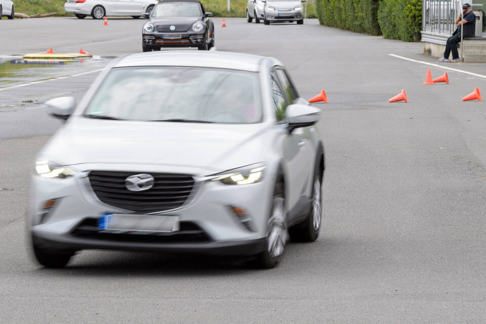 Wie hoch das Stresslevel bei all den Übungen steigt, hängt jedoch nicht nur von der Erfahrung, sondern auch vom Alter des Fahrzeugs ab – auch das gehört zu den Lehren dieses Fahrertrainings. Denn während manch ein verhältnismäßig neuer Wagen der anderen Teilnehmer auch bei den waghalsigsten Vollbremsungen kaum vom Kurs abweicht, dreht es zumindest meinen Golf, Baujahr 1995, regelmäßig auf der nassen Fahrbahn. Hatte sich Omas alter Wagen bei trockener Fahrbahn noch als zuverlässiges Gefährt erwiesen, schlittert er nun nach einem beherzten Tritt auf die Bremse über den Asphalt, bis er in einer Kiesgrube steckenbleibt. Der Schreck sitzt tief, als feststeht: Die Grenzen der Beherrschbarkeit sind endgültig ausgereizt.