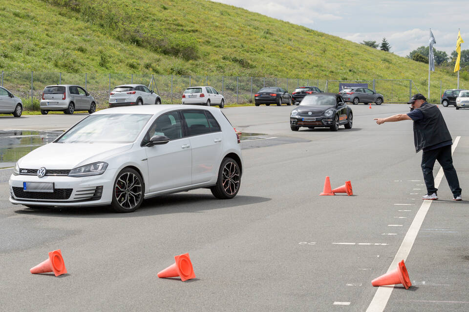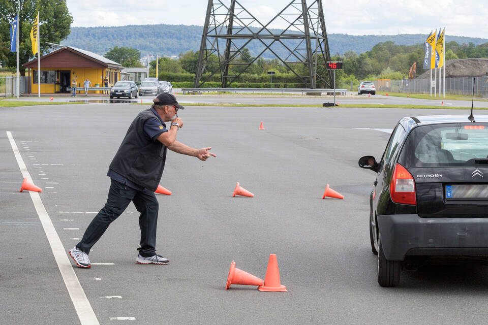 Zu Beginn geht das noch ganz gut, auch wenn es ordentlich ruckelt. Aber Föhr fordert uns heraus. "Tempo, Tempo, Tempo!", verlangt er uns ab. "Und dann haut so auf die Bremse, dass ihr denkt, euer Auto fliegt auseinander." Gar nicht so leicht. Egal ob Audi, Opel, Hyundai oder Skoda, egal ob junger Fahrer oder im frühen Rentenalter: "Zu früh gebremst", meldet der Trainer oft genug zurück, wenn die Bremslichter von einem Mitglied der Sommertour angehen. Oder er kommentiert: "Hier fehlt der Schlag." Es sei die Angst ums Auto, die uns zögern lässt, vermutet der Trainer.