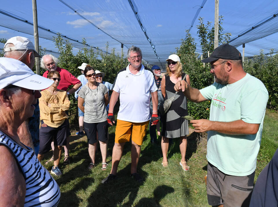 Es sei ohnehin schwierig, Personal zu finden, und auf eine Leiter steige heutzutage keiner mehr. Auch ihn hält der Obstbau auf Trab, besonders in den kritischen Monaten März, April und Mai, wenn die Gefahr von Frost noch nicht gebannt ist. "Manchmal steht mein Mann nachts zehnmal auf und guckt nach den Temperaturen", erzählte Gosia Pfisterer – bei Bedarf hilft die Frostschutzberegnung. Feine Wasserstrahlen schützen Blüten und junge Früchte.