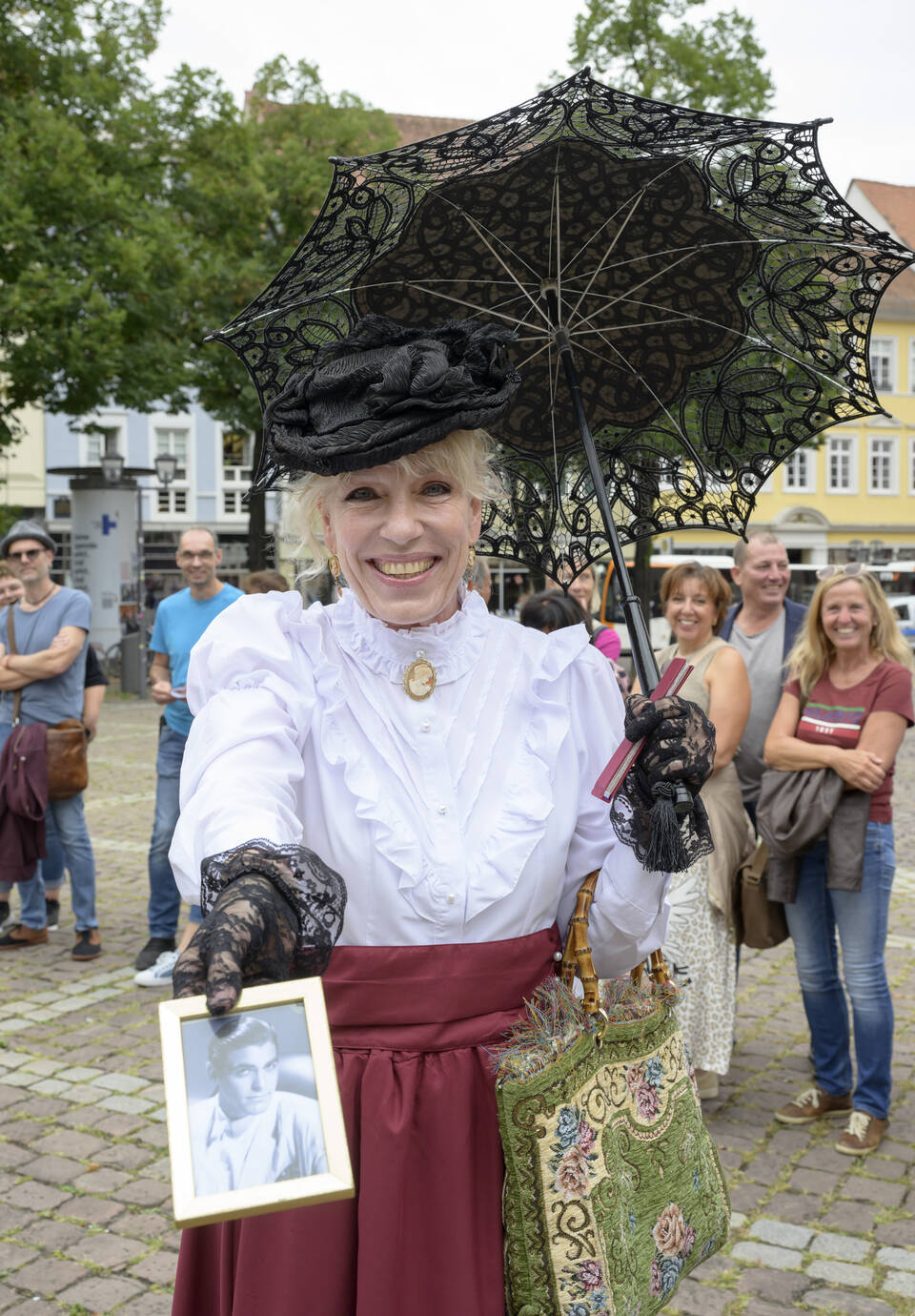 Es dauert keine zwei Minuten, da hat Kahlig, die seit über 20 Jahren Gästeführungen anbietet, die Sommertouristen um den mit schwarzer Spitze behandschuhten Finger gewickelt. Von den Herren gibt es – wie es sich für eine Baronin gehört – einen Handkuss zur Begrüßung, von den Damen einen Knicks und für die RNZ-Redakteurin erst mal Tadel ob ihres dürftigen Beinkleids. Kurze Röcke sind Anfang des 20. Jahrhunderts noch nicht verbreitet.