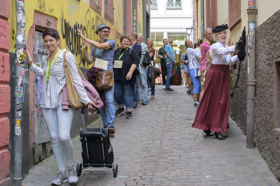Mit den Worten "und jetzt sind Sie dran!", macht sich die Baronin sodann mit ihrem Gefolge auf den Weg in die Altstadtgassen. Ein kurzer Stopp noch an der Plakette, die an Luthers Aufenthalt in Heidelberg erinnert. "Der liegt hier nicht begraben und der Fluss da vorne ist auch nicht der Rhein", informiert Kahlig sicherheitshalber. Überdies bittet sie – gerade zum siebten Mal verwitwet – doch auch Ausschau nach einem potenziellen Gatten Nummer acht zu halten. "Aber bitte alt, gebrechlich und gut gewandet."