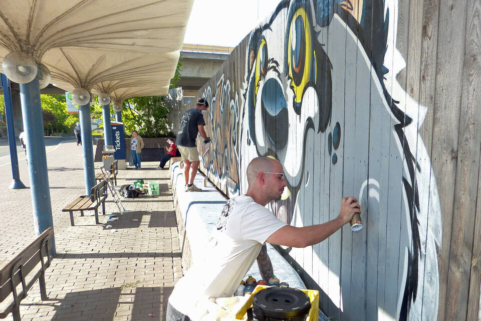 Vier Künstler bemalten den Lattenzaun am ehemalige Rathaus-Center – der bekanntesten Baustelle. Dahinter steckt auch Stadtmarketing.