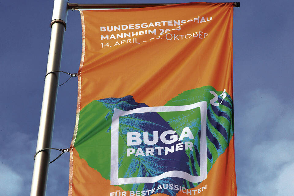 Zuvor hatten die Beteiligten vor dem Rathaus eine Fahne gehisst, die auf die Bundesgartenschau in Mannheim im kommenden Jahr hinweist.