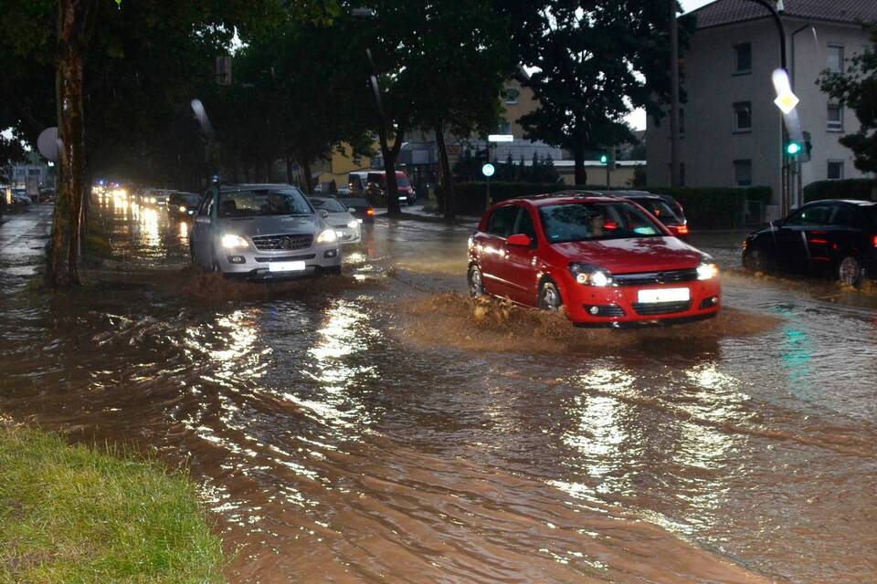 Autofahrer mussten nach dem schweren Unwetter am Samstagabend in Heilbronn mit überfluteten Straßen zurechtkommen. Das Starkregenereignis war eines der schlimmsten der letzten Jahrzehnte. Foto: Andreas Rosar/dpa