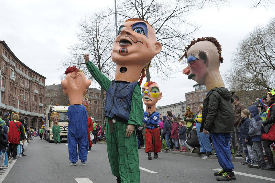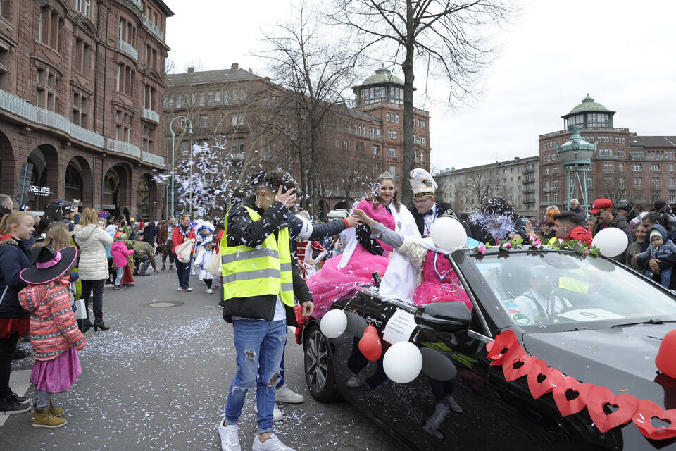 Angeführt vom traditionellen Schriftzug bog pünktlich um 14 Uhr der erste Wagen um die Ecke am Stadthaus, dicht gefolgt von der Kleppergarde der Karneval-Kommission und die Schwellkepp. Jürgen Schreiweis von den Maudacher Mondglotzern informierte die Gäste an der ersten Station über die jeweiligen Zugnummern. "Ihr seid ganz schön viele", musste Schreiweis zugeben, als er die vier Mannheimer Garden, Motiv- und Bagagewägen sowie den Oldtimerbus des Carneval Club Waldhof ankündigte. Von den Narren erntete er dafür Bonbons und Konfetti.