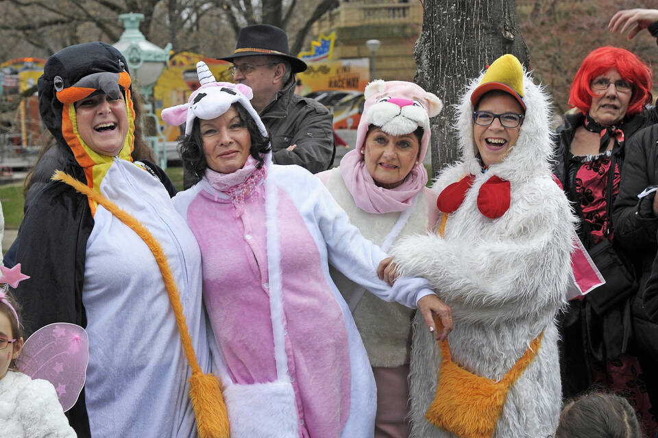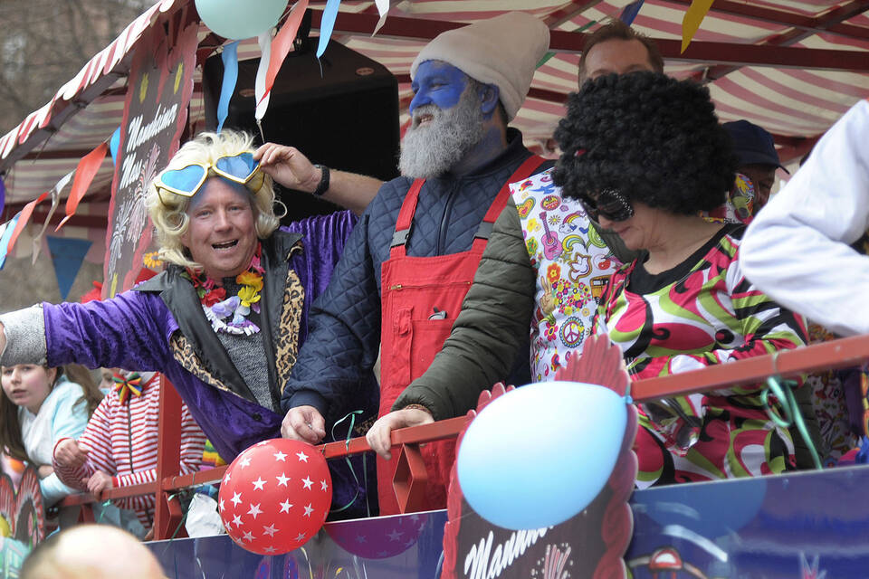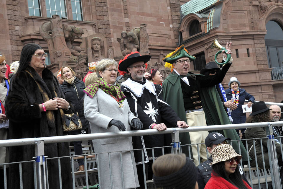Die beiden Stadtoberhäupter waren sich nur bei der Wahl des Sitzplatzes uneins. Während Mannheims Oberbürgermeister Peter Kurz (SPD) den närrischen Lindwurm auf der Ehrentribüne am Wasserturm zwei Stunden lang an sich vorbeiziehen ließ, war seine Ludwigshafener Amtskollegin Jutta Steinruck (SPD) lieber mittendrin: Als Blumenkind grüßte sie vom Wagen der Rheinschanze. Auf der Ehrentribüne saß an ihrer Stelle der Beigeordnete Klaus Dillinger (CDU).