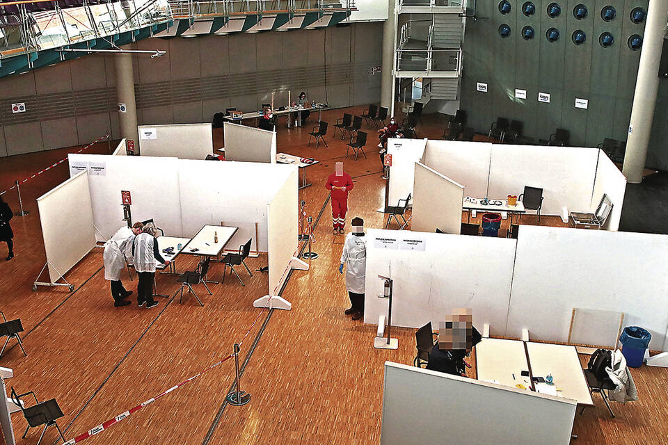 Für die Impfungen in der Hockenheimer Stadthalle haben die Verantwortlichen vor Ort zwei Impfstraßen im großen Saal errichtet. Foto: Lenhardt