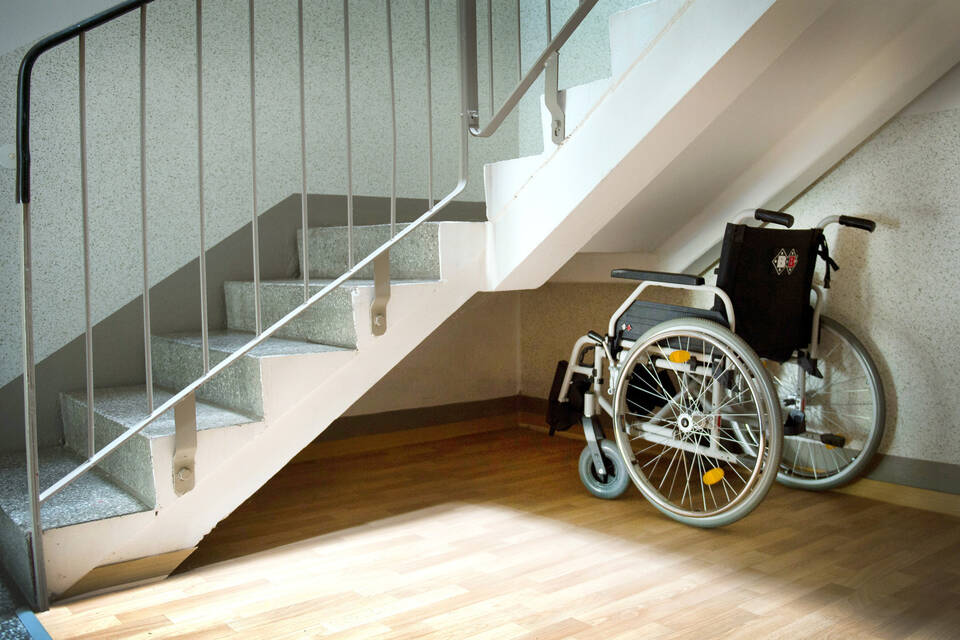 Ein Rollstuhl steht unter einer Treppe. Foto: Burgi/dpa