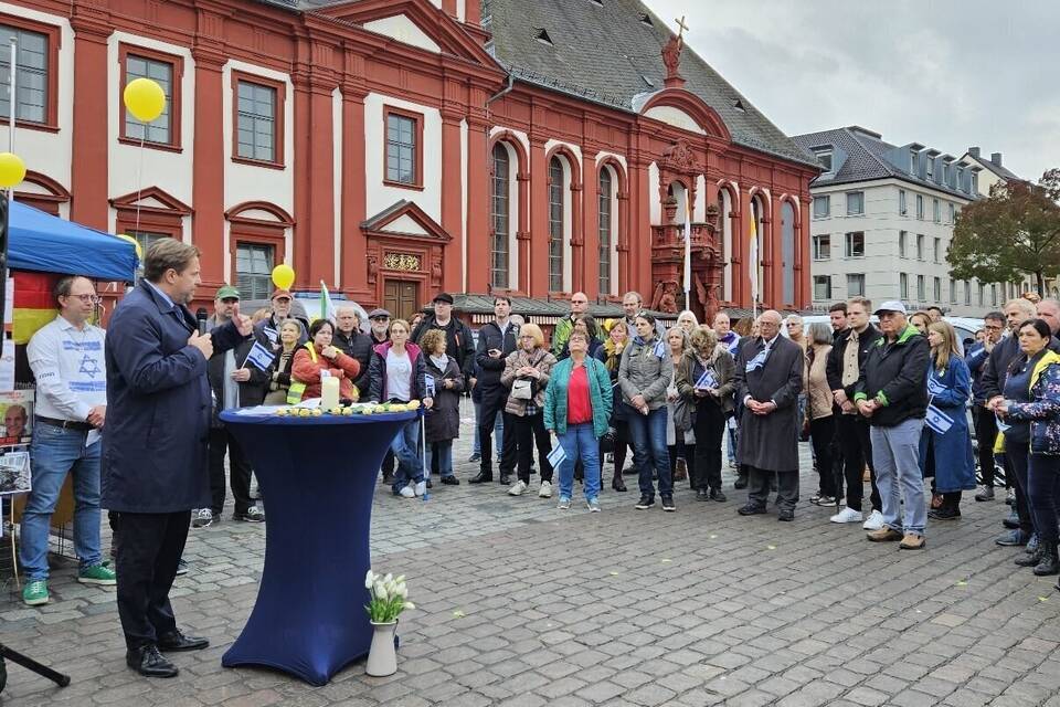 Mannheim. (oka) "Ich hoffe, dass Frieden immer noch möglich ist", erklärte Jonathan, der aus Mannheims Partnerstadt Haifa gekommen war, um an der Gedenkveranstaltung für die Opfer des brutalen Angriffs der Hamas auf Israel teilzunehmen. Circa 200 Menschen hatten sich auf dem Marktplatz versammelt. Bürgermeisterin Diana Pretzell erinnerte an die Geiseln, die sich immer noch in den Händen der