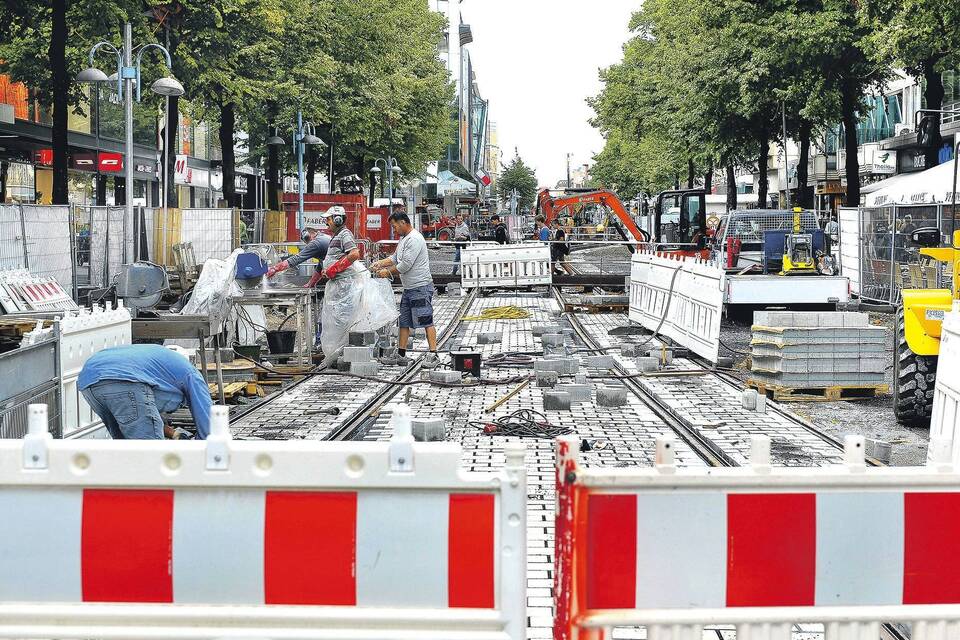 Die Geduld von Anwohnern und Einzelhändlern ist seit Beginn des Umbaus der Einkaufsmeile Planken arg strapaziert worden. Bei einem Ortstermin gelobten die Verantwortlichen Besserung und sicherten die Rückkehr der Straßenbahn wie geplant zum 19. November zu. Foto: Gerold