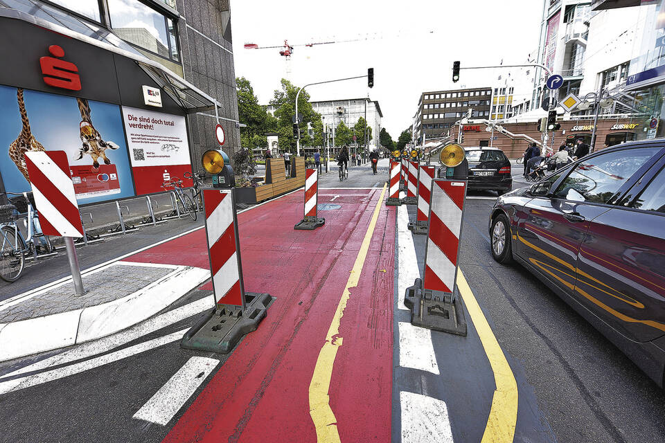 Deshalb hat die Stadt Sitzgelegenheiten und Blumenkübel auf Paletten platzieren lassen, die ein rasches Umsetzen ermöglichen. Hiss kündigt auch an, dass die Stadt die großen Hinweisbanner an insgesamt 13 Standorten aktualisieren werde. Darüber hinaus stehe man bereits mit dem Handel in engem Austausch, um nach einer gemeinsamen Lösung zu suchen. An einer Stelle hat die Stadt schon konkret nachgebessert. So signalisiert eine rote, großflächig eingezeichnete Fläche den Autofahrern zwischen zwei Quadraten (C1 und D1), dass sie nicht mehr die verlängerte Breite Straße queren und geradeaus in die Kunststraße entlang des Paradeplatzes fahren dürfen.