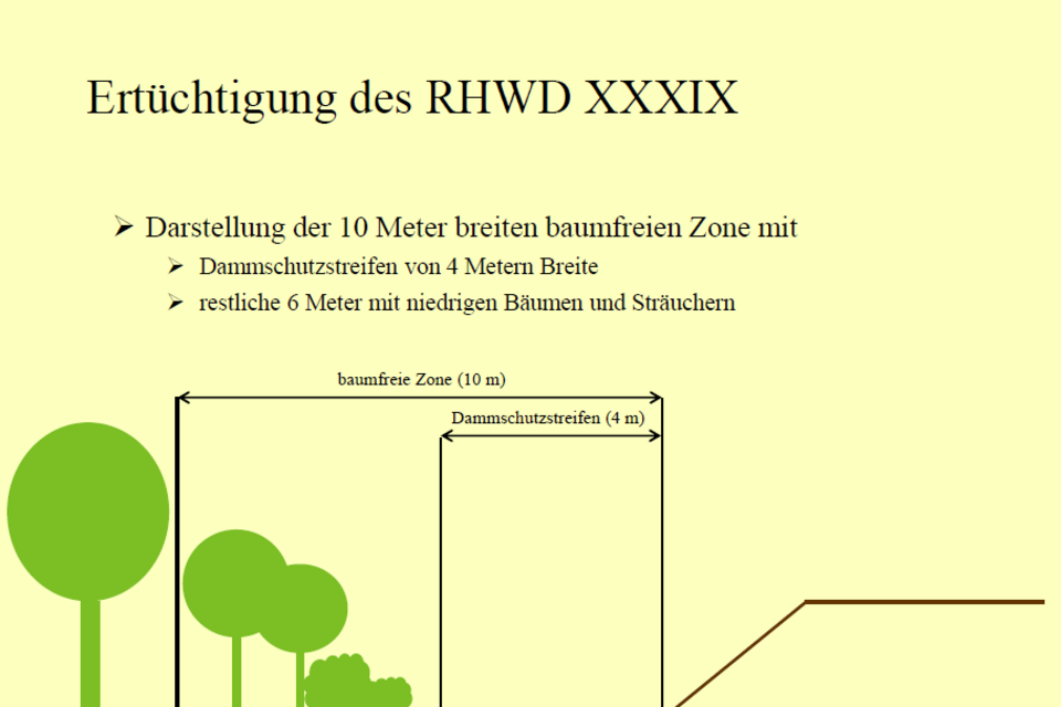 Als Grundlage dienten dem Gutachter die Anforderungen an einen Hochwasserdamm. Dieser brauche befestigte Wege, über die man das Bauwerk erreichen kann und die auch mit schweren Einsatzfahrzeugen befahrbar sein müssen. Gerade die Baumwurzeln könnten hier zum Problem werden: Denn obwohl sie im trockenen Bereich einen Weg auch zusätzlich befestigen können, könne es bei nassem Boden dazu führen, dass die Wege weniger stabil werden. "Der ertüchtigte Damm müsse jedoch allen Risiken und Eventualitäten standhalten", heißt es. Oder konkret: An beiden Seiten des Damms muss es zehn Meter breite Zonen geben, auf denen kein Baum stehen sollte.