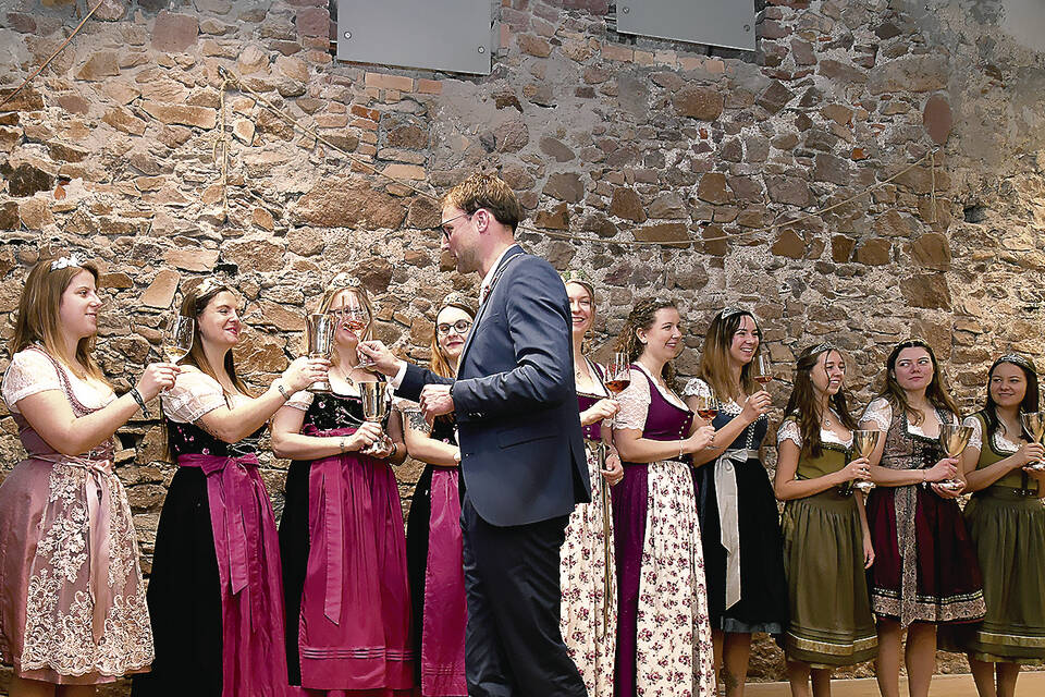 Es waren seine einzigen nachdenklichen Töne an einem zumindest von der Stimmung her heiteren Tag. Lustig wurde es danach nämlich auch im Zehntkeller, in dem sich – ebenso traditionell – die Neuen in der Runde auf der Bühne vorstellen müssen. Nur auf die Küsschen für die Wein- und Winzerhoheiten (aus Schriesheim, Lützelsachsen, Hemsbach und Groß-Umstadt sowie Bereichsweinprinzessin Sofia Hartmann) wurde komplett verzichtet.