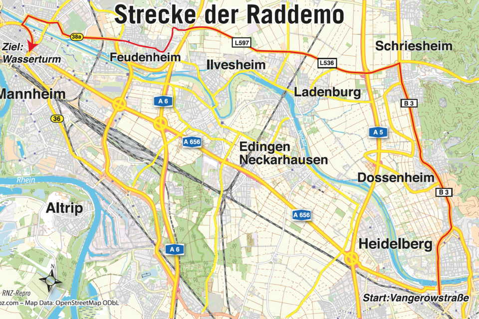 Auf der B 3 geht es über Dossenheim nach Schriesheim, dann über die Landesstraßen 536 und 597, nördlich an Ladenburg vorbei, schnurstracks nach Mannheim. Achtung, Autofahrer: Es kann zu Verkehrsbehinderungen kommen. Ziel ist die Veranstaltung "Sport und Spiel am Wasserturm". Gegen 14 Uhr gehört der Rad-Demo dort die Bühne für die Abschlusskundgebung. Auch Dallinger wird sprechen.