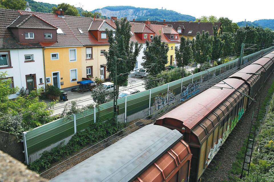 Ein Güterzug fährt an der Weinheimer Nordstadt vorbei. Immerhin gibt es hier eine vollständige Lärmschutzwand - was keineswegs selbstverständlich ist. Dennoch ist die Zweiburgenstadt laut Eisenbahnbundesamt lärmsaniert. Foto: Kreutzer
