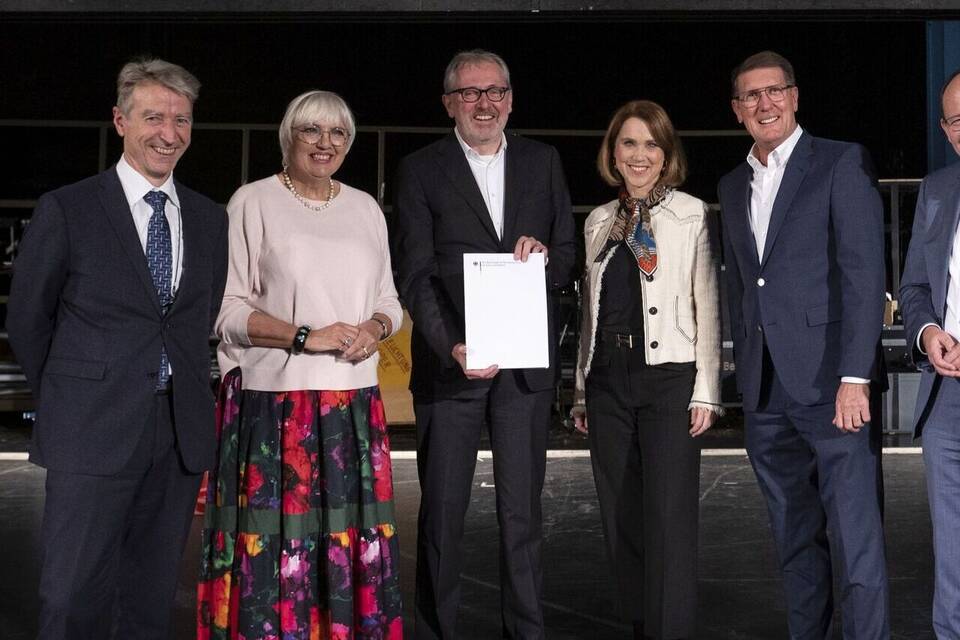 Mannheim. "Es ist eine Freude und Ehre für mich, an diesem besonderen Ort zu sein", ruft Claudia Roth (Grüne) auf der Bühne des Schauspielhauses. "Dieses Gebäude ist ein lebendiges Denkmal für Theaterkultur und Theaterarchitektur." Gemeinsam mit der neuen Kulturministerin Baden-Württembergs, Petra Olschowski (Grüne), ist die Staatsministerin für Kultur und Medien am Mittwochabend ins Nationaltheater gekommen, um den Scheck für die millionenschwere Förderung von Bund und Land für die Generalsanierung zu übergeben.