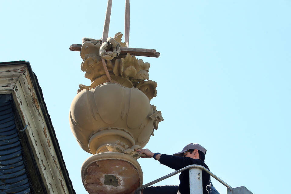Schwetzingen. Die barocken Prunkvasen, die am Schwetzinger Schloss die beiden Zirkelbauten zierten, sind nach aufwändigen Reparaturarbeiten wieder an Ort und Stelle. Am vergangenen Dienstag nahmen die Beauftragten der Bildhauerei Rudi Steigert die vierte Prunkvase an den Haken ihres Krans. Der Firmenchef persönlich hatte zuvor Mörtel in eine Öffnung am Boden der Vase geschoben. Der Mörtel soll das fast zwei Meter hohe 150-Kilo-Schmuckstück auf dem Gesims des südlichen Schlosszirkels fest mit dem Sandsteinfundament und einem darin eingebetteten Stahlstab verbinden. Damit nicht noch einmal solch ein Malheur passiert wie im Sommer 2016.