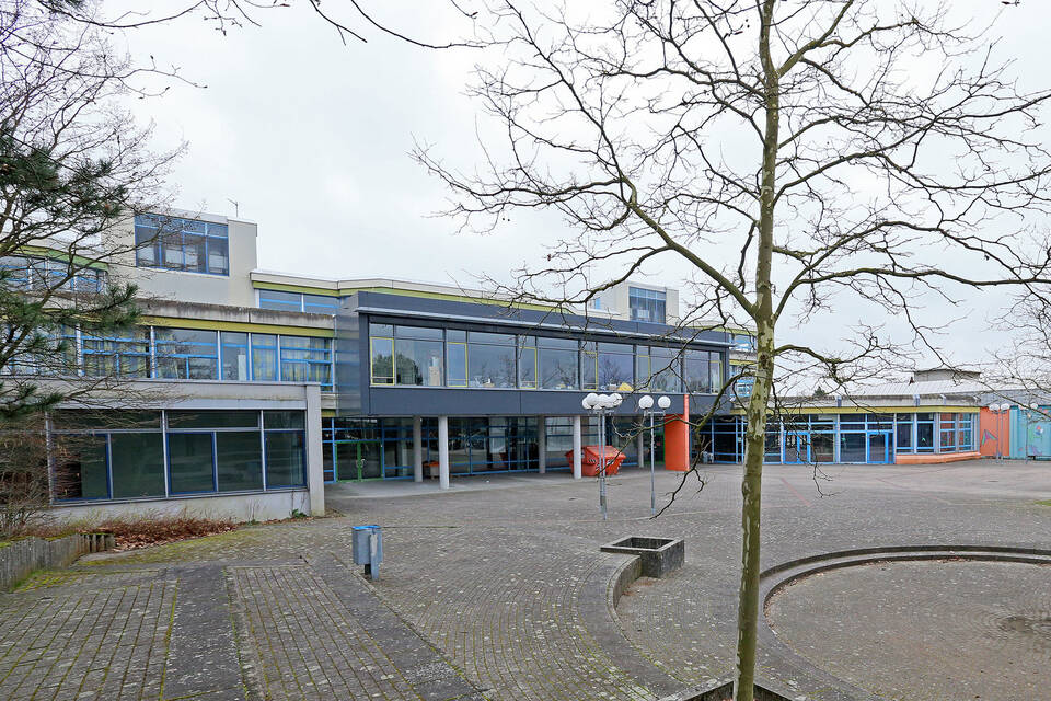 Am letzten Februartag beginnt die Baustelleneinrichtung für den Neubau der Schimper-Gemeinschaftsschule. Das alte Schulgebäude wird später abgerissen. Die Turnhalle bleibt bestehen. Foto: Lenhardt